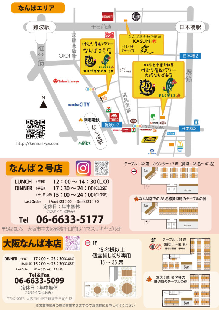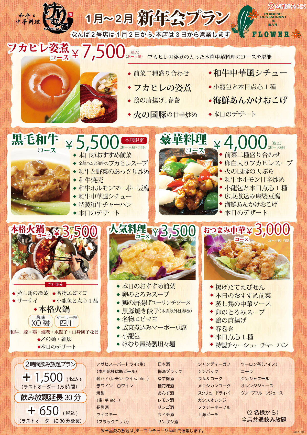 2026年1月2月のお料理コースプランです。けむり屋本店、けむり屋難波2号店、お初天神店でご利用いただけます。料金は税込です。ご予約、ご相談、料理変更や追加なども、御気軽にご相談ください。