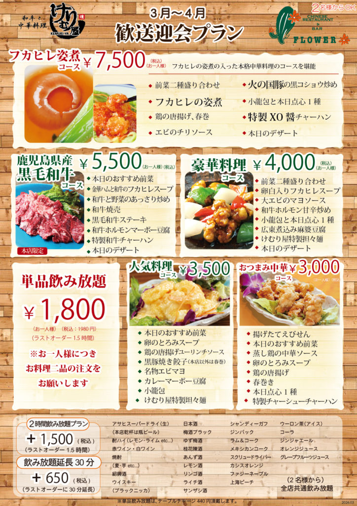 2026年の春の宴会コース料理プランです。本店では、黒毛和牛を取り扱っております。鹿児島県産黒毛和牛のコースなどもご用意しておりますので、ぜひご利用ください。